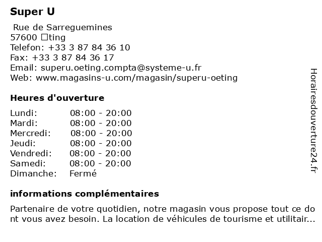 2 Super U Station Service (Distance: 13,39 km) 89 Rue Principale, 57910 Roth Hambach essences, oil, service, services, station, stations essences, super 3 Super U Drive (Distance: 13,39 km) 89 Rue Principale, 57910 Roth Hambach drive, marche, services, super, supermarche 5 Intermarché SUPER Sarreguemines (Distance: 13,90 km) Rue Poincaré, 57200 Sarreguemines intermarché, sarreguemines, super 6 Intermarché SUPER Creutzwald (Distance: 15,47 km) 35 Rue du barrois, 57150 Creutzwald creutzwald, intermarché, super |