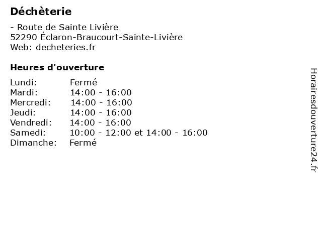 1 Déchèterie (Distance: 8,57 km) - Rue Bonnor, 52100 Saint-Dizier déchèterie, gravats, huiles usées, la réception des déchets et écocentres, les appareils électroménagers, les déchets verts, papier et carton en quantité 2 Déchèterie (Distance: 12,08 km) - Route de Pont-Varin, 52130 Wassy déchèterie, gravats, huiles usées, la réception des déchets et écocentres, les appareils électroménagers, les déchets verts, papier et carton en quantité 3 Déchèterie (Distance: 12,42 km) - de Troisfontaines, 57870 Troisfontaines déchèterie, gravats, huiles usées, la réception des déchets et écocentres, les appareils électroménagers, les déchets verts, papier et carton en quantité 4 Déchèterie (Distance: 12,42 km) - de Troisfontaines, 57870 Troisfontaines déchèterie, gravats, huiles usées, la réception des déchets et écocentres, les appareils électroménagers, les déchets verts, papier et carton en quantité 5 Déchèterie (Distance: 12,71 km) - des Longues Royes, 52410 Eurville-Bienville déchèterie, gravats, huiles usées, la réception des déchets et écocentres, les appareils électroménagers, les déchets verts, papier et carton en quantité 6 Déchèterie (Distance: 14,68 km) - Rue du Patis, 52220 Montier-en-Der déchèterie, gravats, huiles usées, la réception des déchets et écocentres, les appareils électroménagers, les déchets verts, papier et carton en quantité |