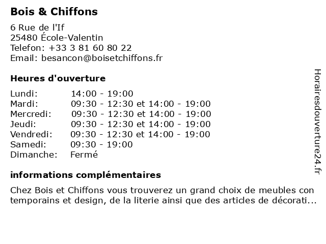 | Mardi | 09:30-12:30 et 14:00-19:00 |