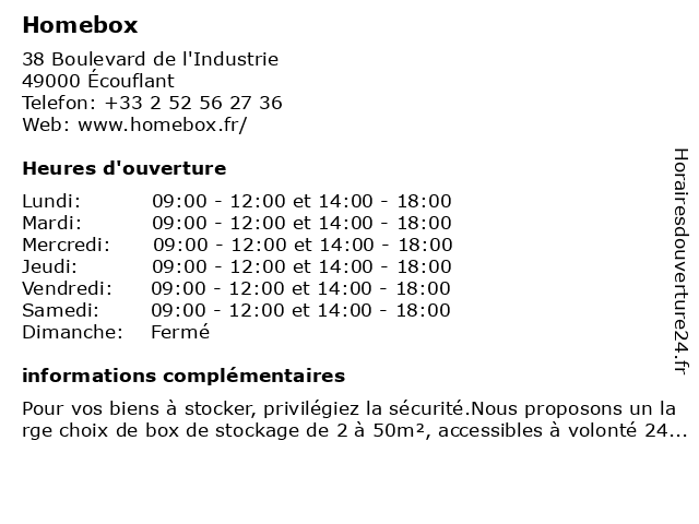 1 Homebox (Distance: 53,20 km) 225 Boulevard de la Prairie, 44150 Saint-Géréon garde meuble, home, homebox, location, service, stockage 2 Homebox Albert Box Franchisé indépendant (Distance: 57,59 km) 12 Avenue de la Marne, 49300 Cholet albert, box, franchisé, homebox, indépendant |