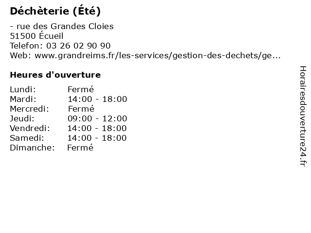 1 Déchèterie (Été) (Distance: 15,12 km) - Avenue Saguet, 51140 Jonchery-sur-Vesle bennes, collecte, débarras, déchets, déchèterie, ordures, été 2 Déchèterie (Hiver) (Distance: 0,00 km) - rue des Grandes Cloies, 51500 Écueil bennes, collecte, débarras, déchets, déchèterie, hiver, ordures 3 Déchèterie (Distance: 5,41 km) - de Gueux, 51390 Gueux déchèterie, gravats, huiles usées, la réception des déchets et écocentres, les appareils électroménagers, les déchets verts, papier et carton en quantité 4 Déchèterie (Distance: 7,54 km) 6 Rue des Rozais, 51500 Rilly-la-Montagne bennes, collecte, débarras, déchets, déchèterie, ordures 5 Trampoline Park Let's Jump - Congés Scolaires Hors été (Distance: 8,30 km) 49 Rue Des Blancs Monts, 51350 Cormontreuil balles aux prisonniers, congés, hors, jump, let's, loisirs intérieur, ninja warrior, park, piscine de cubes en mousse, scolaires, trampoline, été 6 Trampoline Park Let's Jump - Congés d'été (Distance: 8,30 km) 49 Rue Des Blancs Monts, 51350 Cormontreuil balles aux prisonniers, congés, d'été, jump, let's, loisirs intérieur, ninja warrior, park, piscine de cubes en mousse, trampoline |