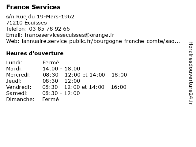 | 1 France Services (Distance: 6,83 km) 7 Rue Hélène Brion, 71200 Le Creusot administration, communes, france, service, services, services publics 2 France Services (Distance: 10,79 km) s/n Place Salignac-Fénelon, 71200 Saint-Sernin-du-Bois administration, au, bois, de, du, france, maison, organismes, public, publics, saint, sernin, services 3 France Services (Distance: 14,52 km) 4 Route de Davenay, 71390 Buxy administration, communes, france, service, services, services publics 4 France Services (Distance: 14,63 km) 43 Rue de la Coudraie, 71300 Montceau-les-Mines administration, communes, france, service, services, services publics 5 France Services (Distance: 14,89 km) 42 Avenue de Bourgogne, 71390 Saint-Désert administration, communes, france, service, services, services publics 6 France Services (Distance: 19,91 km) - Place de l'Hôtle de Ville, 71460 Saint-Gengoux-le-National administration, communes, france, service, services, services publics |