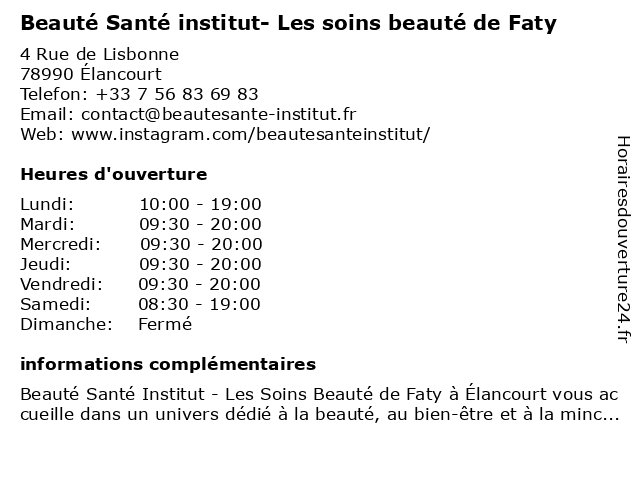 2 Natural Spa Institut (Distance: 1,20 km) 2 Rue Pablo Picasso, 78370 Plaisir beauté, institut, manucure, massage, natural, soins, spa, épilation 3 Institut Ô Coeur de l'Âme (Distance: 3,13 km) 1 Rue du Moulin, 78340 Les Clayes-sous-Bois coeur, coiffeur, coiffure, coupe, de, institut, l'âme, soins 4 Noel Institut (Distance: 3,47 km) 36 Avenue Paul Vaillant Couturier, 78190 Trappes beauté, construction d'ongles artificiels, institut, manucure, noel, ongles 5 Institut de beauté Plaisir Bodyminute (Distance: 4,00 km) 161 Chemin Départemental, 78370 Plaisir beauté, bodyminute, de, institut, plaisir 6 Institut de Beauté Esprit Zen (Distance: 4,08 km) 43 Avenue Paul Vaillant Couturier, 78390 Bois-d'Arcy beauté, de, esprit, institut, zen |
