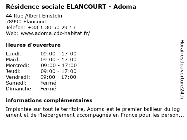 1 Résidence sociale ELANCOURT - Adoma (Distance: nan km) 44 Rue Albert Einstein, 78990 Élancourt adoma, elancourt, résidence, sociale 2 Centre Communal d'Action Sociale (CCAS) (Distance: 1,53 km) - Square de la Marche, 78310 Maurepas action, ccas, centre, communal, d'action, sociale 3 Centre Communal d'Action Sociale - CCAS (Distance: 6,38 km) - Place Charles de Gaulle, 78340 Les Clayes-sous-Bois action, ccas, centre, communal, d'action, sociale 4 Centre Communal d'Action Sociale (CCAS) (Distance: 7,92 km) - Place du 8 Mai 1945, 78330 Fontenay-le-Fleury action, ccas, centre, communal, d'action, sociale 5 Centre Communal d'Action Sociale (CCAS) (Distance: 11,64 km) 22 Rue de la République, 78650 Beynes action, ccas, centre, communal, d'action, sociale 6 Direction Départementale De La Cohésion Sociale (Distance: 13,90 km) 7 rue Jean-Mermoz, 78008 Versailles administration, assoc, cohésion, de, direction, départementale, la, services, services publics, sociale |
