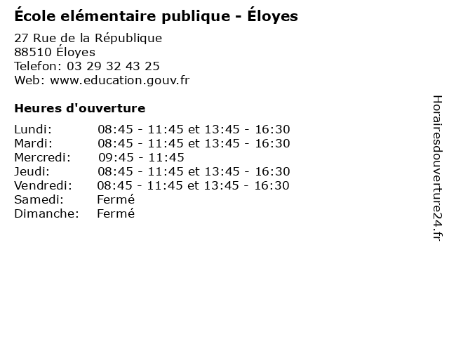 1 École elémentaire publique - Éloyes (Distance: 0,30 km) 3 Passage des Chalets, 88510 Éloyes ecole, education, elémentaire, maternelle, publique, services, école, éloyes 2 École Elémentaire Publique Les Tilleuls (Distance: 0,30 km) 6 Rue Charles de Gaulle, 88510 Eloyes cours, education, elémentaire, les, publique, services, tilleuls, École, école, élémentaire 3 École elémentaire publique - Pouxeux (Distance: 3,27 km) - Rue de la gare, 88550 Pouxeux ecole, education, elémentaire, maternelle, pouxeux, publique, services, école 4 École Elémentaire Publique Le Fossard (Distance: 7,53 km) 11 Route de Xennois, 88200 Saint-Étienne-lès-Remiremont cours, education, elémentaire, fossard, le, publique, services, École, école, élémentaire 5 École elémentaire publique - Saint-Étienne-lès-Remiremont (Distance: 7,68 km) 8 Rue Jules Ferry, 88200 Saint-Étienne-lès-Remiremont ecole, education, elémentaire, lès, maternelle, publique, remiremont, saint, services, école, étienne 6 École elémentaire publique - Saint-Amé (Distance: 8,74 km) 89 Grande rue, 88120 Saint-Amé amé, ecole, education, elémentaire, maternelle, publique, saint, services, école |