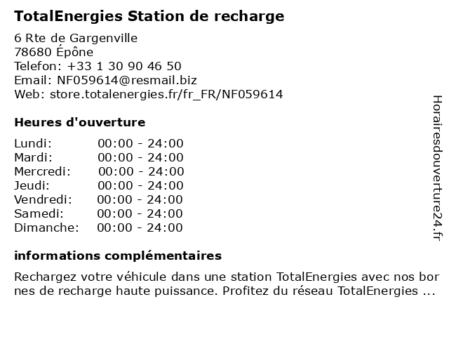 1 TotalEnergies Station de recharge (Distance: 7,12 km) 4 Rue de Chantereine, 78711 Mantes-la-Ville borne de recharge, borne de recharge autoroute, borne de recharge rapide, ccs, chademo, charge haute puissance, charge+, charging station, de, ev, high power charge, ma charge rapide, mobility, recharge, recharger ma voiture, recharger voiture, station, station autouroute, station de recharge, station-service, supercharger, tankstelle, total, totalaccess, totalenergie, totalenergies 2 TotalEnergies Access - RELAIS DE LA MAULDRE (Distance: 0,05 km) 8 ROUTE DE GARGENVILLE, 78680 EPONE access, borne de recharge, charging station, de, la, mauldre, recharger ma voiture, relais, totalenergies 3 TotalEnergies - SARL POMMIER BENOIT FILS (Distance: 1,02 km) 30 RUE DU PROFESSEUR EMILE SERGENT, 78680 EPONE benoit, fils, gas station, pommier, sarl, station service, tankstelle, total, totalenergies 4 TotalEnergies Access - RELAIS DES CHAMPARTS (Distance: 6,06 km) 60 AV. DE LA PAIX, 78520 LIMAY access, champarts, des, gas station, relais, station service, tankstelle, total, totalenergies 5 TotalEnergies - SAS CONNECT AUTOMOBILES FRANCE (Distance: 7,10 km) 4 ROUTE DE CHANTEREINE, 78711 MANTES LA VILLE automobiles, borne de recharge, charging station, connect, france, recharger ma voiture, sas, totalenergies 6 TotalEnergies - RELAIS LA VILLE JOLIE (Distance: 8,73 km) 48 BD ROGER SALENGRO, 78711 MANTES LA VILLE gas station, jolie, la, relais, station service, tankstelle, total, totalenergies, ville |