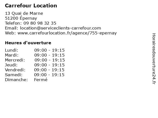 1 Carrefour Banque (Distance: 0,15 km) 13 Quai de la Marne, 51200 Epernay assurances, banque, carrefour, services 2 Carrefour City (Distance: 0,90 km) 13-17 Place Hugues Plomb, 51200 Epernay alimentation, carrefour, city, magasin discount, market, supermarché 3 E.Leclerc Location (Distance: 1,93 km) - route de Cumières, 51530 Dizy automobile, e.leclerc, fourgon, leclerc, location, véhicule 4 Carrefour Contact Marché (Distance: 2,10 km) - Lieu-Dit Moulin de la Goesse, 51200 Epernay carrefour, contact, marché, matériel de jardin, meubles, électroménager, étagères autres offres: 5 Carrefour Station Service (Distance: 3,66 km) 13 Quai de la Marne, 51200 Epernay automobiles, carrefour, oil, service, services, station, stations essences 6 Carrefour (Distance: 3,66 km) 13 Quai de la Marne, 51200 Epernay carrefour, hard discount, hypermarchés, les dépanneurs, supermarchés |