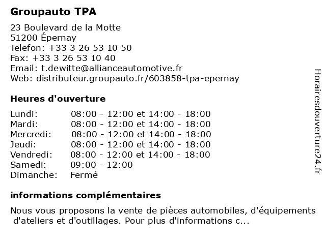 3 Groupe Tpa (Distance: 40,90 km) . Avenue de l'Europe, 02400 Château-Thierry accessoires, atelier, auto, groupe, magasin, outillage, pieces, tpa, équipements |