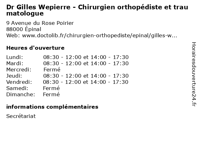1 Dr Laurent Boulard - Chirurgien orthopédiste et traumatologue (Distance: nan km) 9 Avenue du Rose Poirier, 88000 Épinal boulard, chirurgien, consultation, docteur, dr, et, laurent, med, medecine, medical, médecin, orthopédiste, traitement, traumatologue 2 Dr Gilles Gerardin - Médecin généraliste (Distance: nan km) 9 Avenue du Rose Poirier, 88000 Épinal docteur, dr, generaliste, gerardin, gilles, généraliste, medical, médecin, soin 3 Dr Jean-Manuel Poircuitte - Chirurgien orthopédiste et traumatologue (Distance: 0,05 km) 9 Avenue du Rose Poirier, 88000 Épinal chirurgie, chirurgien, dr, et, general, jean, manuel, orthopédiste, poircuitte, soins, traumatologue 4 Dr Romain Detammaecker - Chirurgien orthopédiste et traumatologue (Distance: 0,05 km) 9 Avenue du Rose Poirier, 88000 Épinal chirurgien, consultation, detammaecker, docteur, dr, et, med, médecin, orthopédiste, romain, traitement, traumatologue 5 Medecin Frederic Pfeffer (Chirurgien orthopédiste et traumatologue) (Distance: 0,06 km) 9 Avenue du Rose Poirier, 88060 Epinal chirurgien, docteur, et, frederic, medecin, orthopédiste, pfeffer, sante, services, traumatologue 6 Dr George Hanna - Chirurgien orthopédiste (Distance: 2,43 km) 3 Avenue Robert Schuman, 88000 Épinal chirurgien, consultation, docteur, dr, george, hanna, med, medecine, medical, médecin, orthopédiste, traitement |