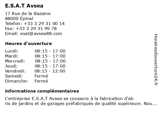 1 E.S.A.T Les Tilleuls AVSEA (Distance: 0,76 km) 1 Allée des Tilleuls, 88000 Épinal avsea, e.s.a.t, les, tilleuls |
