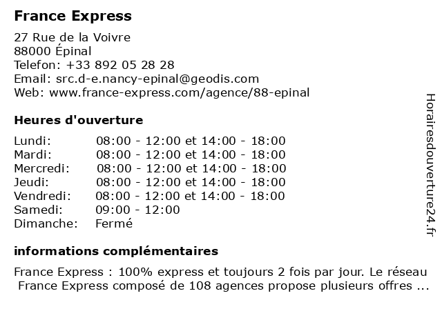 1 France Express (Distance: 0,05 km) 27 Rue de la Voivre, 88000 Epinal express, france, poste, services, transporteur 2 GEODIS | Distribution & Express - Agence d'Epinal (Distance: 0,00 km) 27 Rue de la Voivre, 88000 Épinal agence, d'epinal, distribution, express, geodis 3 France Express (Heures limites de dépôt) (Distance: 0,05 km) 27 Rue de la Voivre, 88000 Epinal de, dépôt, express, france, heures, limites, poste, services, transporteur 6 France Pare Brise (Distance: 4,03 km) 6 Rue d'Alsace, 88000 Épinal bris de glace, brise, france, pare, services |