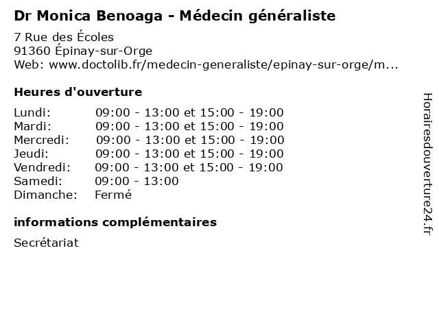 | Lundi | 09:00-13:00 et 15:00-19:00 |