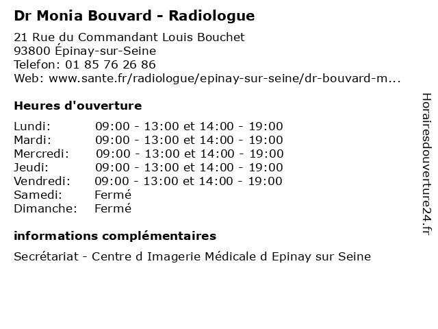 1 Dr Monia Bouvard - Radiologue (Distance: 4,68 km) 340 Avenue d’Argenteuil, 92600 Asnières-sur-Seine bouvard, consultation, docteur, dr, med, monia, médecin, radiologue, traitement 2 Dr Monia Bouvard - Radiologue (Distance: 6,39 km) 108 Rue du Ruisseau, 75018 Paris bouvard, consultation, docteur, dr, med, monia, médecin, radiologue, traitement 3 Dr Monia Benkraiem - Anesthésiste (Distance: 4,15 km) 2 Rue Du Dr Delafontaine, 93205 Saint Denis anesthésiste, benkraiem, consultation, docteur, dr, med, monia, médecin, traitement 4 Dr Monia Hafsa - Radiologue (Distance: 8,11 km) 9 Rue de Turin, 75008 Paris consultation, docteur, dr, hafsa, med, monia, médecin, radiologue, traitement 5 Maître Florence Bouvard - Avocate (Distance: 8,17 km) 70 Boulevard de Courcelles, 75017 Paris avocate, avocats, bouvard, cabinet, conseils, contentieux, florence, juridique, justice, litiges, maître, services 6 Dr Monia Hafsa - Radiologue (Distance: 8,24 km) 21 Rue de Chazelles, 75017 Paris diagnostique, dr, hafsa, imagerie, monia, radiologie, radiologue, thérapeutique |