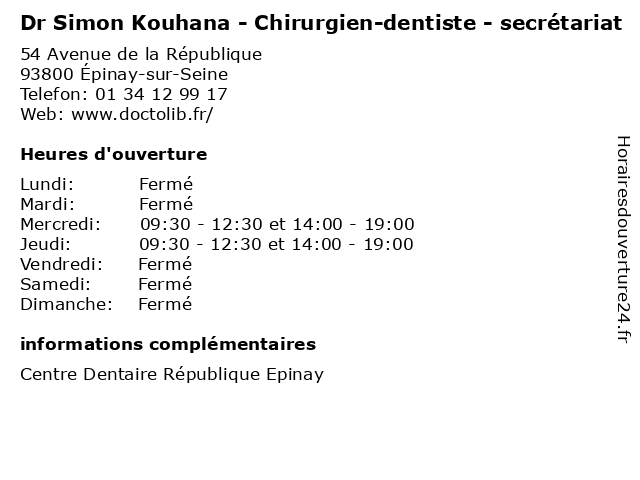 1 Dr Simon Kouhana - Chirurgien-dentiste - secrétariat (Distance: 0,00 km) 54 Avenue de la République, 93800 Épinay-sur-Seine chirurgien, chirurgien-dentiste, dentiste, dr, kouhana, médecins, médicaments, santé, secrétariat, simon, spécialiste 2 Dr Simon Kouhana - Chirurgien-dentiste - secrétariat (Distance: 0,00 km) 54 Avenue de la République, 93800 Épinay-sur-Seine chirurgien, chirurgien-dentiste, dentiste, dr, kouhana, médecins, médicaments, santé, secrétariat, simon, spécialiste 3 Martynoff Simon (Distance: 5,55 km) 85 Rue des Rosiers, 93400 Saint-Ouen architecture, art forain, bijoux, céramiques, martynoff, mobilier, peintures & arts graphiques, simon 4 École élémentaire application Simon Bolivar Eb (Distance: 8,74 km) 119 Avenue Simon Bolivar, 75019 Paris application, bolivar, cours, eb, servicios, simon, école, élémentaire 5 École élémentaire publique Simon Bolivar (Distance: 8,74 km) 119 Avenue Simon Bolivar, 75019 Paris bolivar, cours, publique, servicios, simon, école, élémentaire 6 Relais Colis® / SIMON ZENTHAL OPTIQUE (Distance: 8,91 km) 44 RUE DE PONTHIEU, 75008 Paris colis, colis®, optique, relais, services postaux et de livraison, simon, zenthal  |