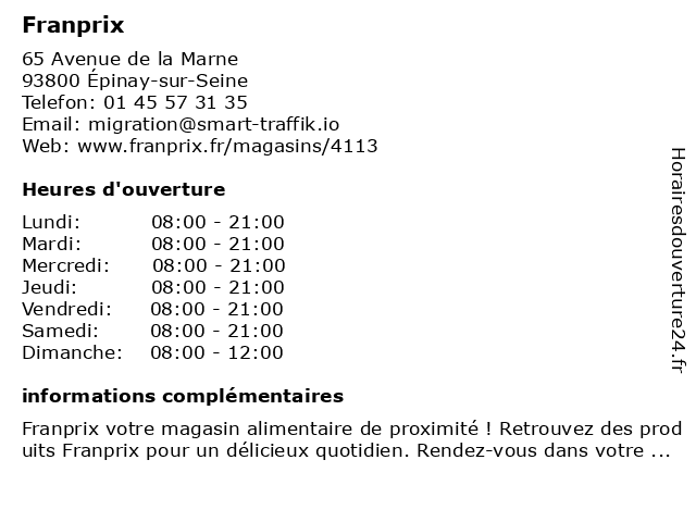 1 Franprix (Distance: 0,99 km) 6 avenue Léon Blum, 93800 Épinay-sur-Seine bibi, carte de fidélité, courses, franprix, magasin, produits frais, programme de fidélité, supermarché, épicerie 2 Franprix (Distance: 1,42 km) 7-9 Rue d'Ormesson, 95170 Deuil-la-Barre alimentation, franprix, fruits, legumes, superettes 3 Franprix (Distance: 1,70 km) 5 Rue Berthelot, 93450 L'Île-Saint-Denis bibi, carte de fidélité, courses, franprix, magasin, produits frais, programme de fidélité, supermarché, épicerie 4 Franprix (Distance: 1,89 km) 6 rue des Ecoles, 95880 ENGHIEN LES BAINS alimentation générale, entretien de la maison et de l'hygiène, franprix, franprix magasin, fruits et légumes frais 5 Franprix (Distance: 2,36 km) 1 Rue de Verdun, 93450 L'Île-Saint-Denis bibi, carte de fidélité, courses, franprix, magasin, produits frais, programme de fidélité, supermarché, épicerie 6 Franprix (Distance: 3,79 km) 6 Rue de Pontoise, 95160 Montmorency bibi, carte de fidélité, courses, franprix, magasin, produits frais, programme de fidélité, supermarché, épicerie |