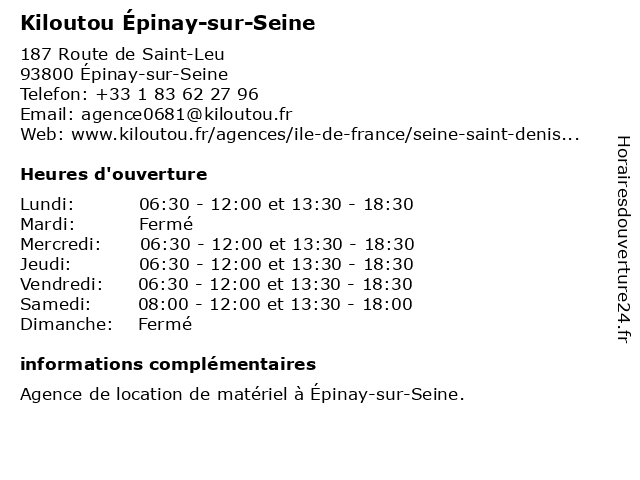 1 Kiloutou Épinay-sur-Seine (Distance: 0,02 km) 187 Route de Saint-Leu, 93800 Épinay-sur-Seine kiloutou, seine, sur, épinay 4 Kiloutou - Direction Commerce et Marketing (Distance: 8,15 km) 8 Rue Gaston Rebuffat, 75019 Paris commerce, direction, et, kiloutou, location de matériel, location matériel btp, location matériel chantier, location outils, marketing 5 Kiloutou (Distance: 11,05 km) . Rue Lucien Sampaix, 95190 Goussainville air, energie, kiloutou, materiel, sanitaires, services, transport 6 |