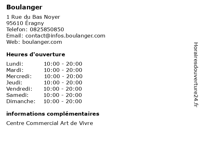1 Boulanger (Distance: 4,48 km) - D915, 95520 Osny boulanger, console, cuisine, jeux, multimédia, télévision, électroménager 2 Boulanger (Distance: 7,99 km) , Boulevard Victor Bordier, 95370 Montigny Les Cormeilles boulanger, magasin d'électroménager, multimédia, téléphonie 3 Boulanger (Distance: 14,28 km) n/a Chemin aux Boeufs, 78630 Orgeval boulanger, console, cuisine, jeux, multimédia, télévision, électroménager 4 Boulanger (Distance: 19,16 km) 112 Avenue du Général de Gaulle, 92230 Gennevilliers boulanger, console, cuisine, jeux, multimédia, télévision, électroménager 5 Boulanger Eragny Sur Oise (Distance: 0,07 km) 1 Rue Du Bas Noyer, 95610 Eragny boulanger, eragny, location d'appareils électroménagers, magasin d'informatique, magasin de jeux vidéo, oise, sur, vente d'aspirateurs, vente d'imprimantes, vente de réfrigérateurs 6 Boulanger Osny (Distance: 5,24 km) Centre Commercial De L'oseraie, 95520 Osny boulanger, location d'appareils électroménagers, magasin d'informatique, magasin de jeux vidéo, osny, vente d'aspirateurs, vente d'imprimantes, vente de réfrigérateurs |