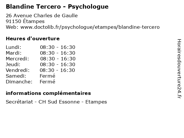 1 Ets Beauvallet Blandine (Distance: 7,47 km) 27 Rue du Triquoir, 91690 Guillerval beauvallet, blandine, ets 2 Blandine Tercero - Psychologue - secrétariat (Distance: 16,71 km) 2 Rue du Potelet,, 91410 Dourdan blandine, médecins, médicaments, psychologue, santé, secrétariat, spécialiste, tercero 3 Sylvie Pecquerie - Psychologue (Distance: 0,00 km) 26 Avenue Charles de Gaulle, 91150 Étampes médecin, médecine, pecquerie, psychologie, psychologue, sylvie 4 Marie Decaux - Psychologue (Distance: 0,00 km) 26 Avenue Charles de Gaulle, 91150 Étampes decaux, marie, médecin, médecine, psychologie, psychologue 5 Dr Blandine de Singly - Gastro-entérologue (Distance: 31,41 km) 40 avenue Serge Dassault, 91106 Corbeil-Essonnes blandine, cancer, cancérologie, ch, corbeil, de, dr, entérologie, entérologue, essonnes, francilien, gastro, singly, sud 6 Clémence Chabolle - Psychologue (Distance: 40,55 km) 13 Rue de France, 77300 Fontainebleau chabolle, clemence, clémence, médecin, médecine, psychologie, psychologue |
