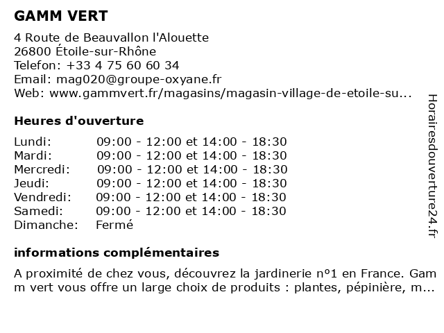1 GAMM VERT (Distance: 6,20 km) Les Rollands, 26120 Montmeyran animalerie, gamm, jardin, jardinerie, mobilier de jardin, plantes, pépinière, vert 3 GAMM VERT (Distance: 9,89 km) Allée des Crozes, 26270 Loriol-sur-Drôme animalerie, gamm, jardin, jardinerie, mobilier de jardin, plantes, pépinière, vert 4 GAMM VERT (Distance: 11,75 km) 44 Avenue Louis Masson, 26120 Chabeuil animalerie, gamm, jardin, jardinerie, mobilier de jardin, plantes, pépinière, vert 6 |