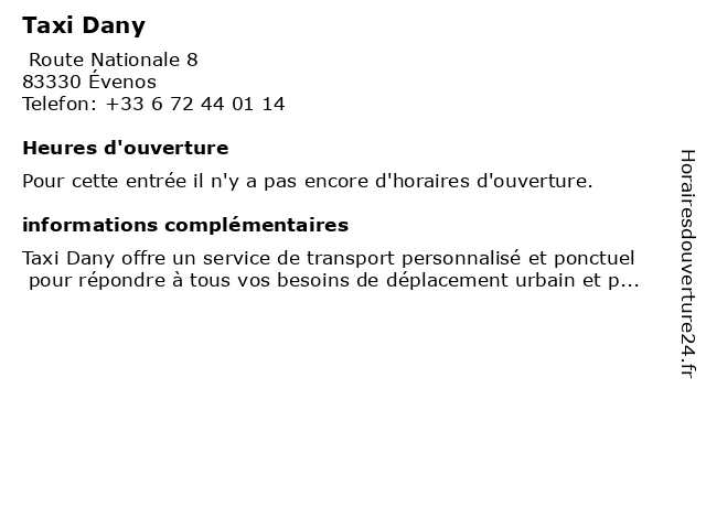 Taxi Dany offre un service de transport personnalisé et ponctuel pour répondre à tous vos besoins de déplacement urbain et périurbain. Dotés de véhicules confortables et bien entretenus, nos...