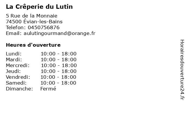 1 Au Lutin Gourmand (Distance: 0,34 km) 27 rue Nationale, 74500 Evian-les-Bains alimentation, au, condiments, gourmand, gâteaux, lutin, épicerie 2 Crêperie Le Petit Breton (Distance: 0,44 km) 16 Rue Nationale, 74500 Évian-les-Bains breton, crêperie, cuisine, le, menus, petit, repas, restaurant 3 Crêperie du Lac (Distance: 16,69 km) 30 Quai André Chevallay, 74500 Saint-Gingolph boissons, creperie, crêperie, du, lac, restaurants 4 Crêperie Les Flocons (Mi-Décembre à Mars) (Distance: 28,68 km) - Le Praz de Lys, 74440 Taninges crêperie, décembre, flocons, galettes, les, mars, mi, restaurant, restauration 5 Crêperie des Arts - Bar (Distance: 34,25 km) 93 Place Perdtemps, 01220 Divonne-les-Bains arts, bar, crêperie, des, restaurant, restauration 6 Crêperie des Arts - Restaurant (Distance: 34,25 km) 93 Place Perdtemps, 01220 Divonne-les-Bains arts, crêperie, des, restaurant, restauration |