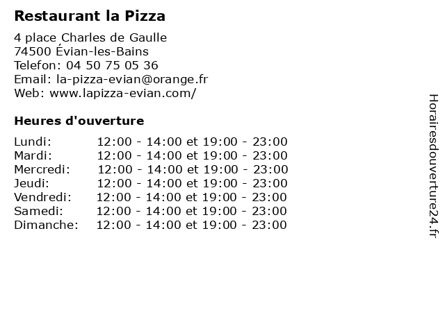 1 Robinson Pizza (Distance: 0,05 km) 4 rue de l'Eglise, 74500 Évian-les-Bains bar, café, franck, morais, pizza, restaurants, robinson 2 Rapido Pizza (Distance: 0,10 km) 8 Rue de la monnaie, 74500 Evian Les Bains cuisine, italienne, lasagnes, pizza, pizzeria, pâtes, rapido, restaurant, restauration 3 Baïla Pizza (Distance: 3,49 km) 1005 route départementale, 74500 Amphion-les-bains baïla, italien, livraison, pizza, pizzéria, restaurant 4 Baïla Pizza (vente à emporter) (Distance: 4,97 km) - Route departemental 1005, 74500 Amphion-les-bains baïla, emporter, pizza, restaurant, restauration, vente 5 Cédric Pizza (Distance: 8,48 km) 28 avenue de l'Ermitage, 74200 Thonon-les-Bains cédric, emporter, pizza, pizzeria, restauration 6 Bella Pizza (Distance: 8,85 km) 1 rue des Ursules, 74200 Thonon-les-Bains bella, boissons, livraison, pizza, pizzas, pizzeria, restaurant  |