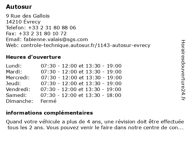 1 Sécuritest Contrôle Technique Automobile (Distance: 0,01 km) Route de Caen, 14210 Évrecy automobile, centre de contrôle technique, contre visite, contrôle, contrôle pollution, contrôle technique, contrôle technique automobile, securitest, sécuritest, technique, véhicule léger 2 AS Auto Sécurité Contrôle technique - CTA 14 - Verson (Distance: 6,20 km) 3 Rue Des 4 Vents, 14790 VERSON 14, as, auto, contrôle, cta, sécurité, technique, verson 3 Autovision - Contrôle Technique Auto de l'Odon (Distance: 8,46 km) 20 Avenue de la Voie au Coq, 14760 Bretteville-sur-Odon auto, automobile, autovision, contrôle, contrôle technique, de, l'odon, maintenance, technique 4 AS Autosécurité Contrôle Technique SAINT ANDRE SUR ORNE (Distance: 9,01 km) 24 Rue Alfred Lefevre, 14320 SAINT ANDRE SUR ORNE andre, as, autosécurité, contrôle, orne, saint, sur, technique 5 Sécuritest Contrôle Technique Automobile (Distance: 13,06 km) 22 Rue de la Gare, 14000 Caen automobile, centre contrôle technique, contre visite, contrôle, contrôle pollution, contrôle technique, contrôle technique automobile, securitest, sécuritest, technique, véhicules léger 6 Centre contrôle technique DEKRA (Distance: 13,40 km) 22 Rue des Compagnons, 14000 Caen 4x4, camping car, centre, collection, contrôle, dekra, diesel, electrique, essence, gazole, suv, technique, utilitaire, voiture |