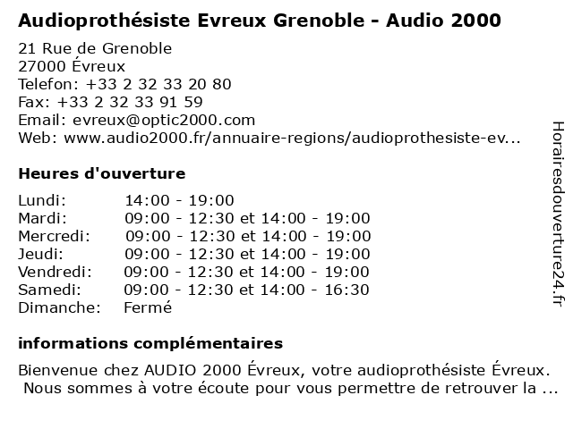 1 Opticien Évreux - Optic 2000 - L et JC BARGE (Distance: 0,02 km) 21 Rue de Grenoble, 27000 Évreux 2000, barge, et, jc, lentilles de contact, lunettes de soleil, lunettes de vue, optic, optic2000, opticien, opticien optic2000, ray-ban, rayban, évreux 2 Duroc Audition - Audioprothésiste - Evreux (Distance: 0,09 km) 62 Rue du Dr Oursel, 27000 Évreux audioprothésiste, audition, duroc, evreux 3 Audio 2000 (Distance: 0,13 km) 27 Rue de Grenoble, 27000 Evreux 2000, audio, audioprothesistes, auditifs, magasins.audio, vente 4 Parking Q-Park Evreux Hôtel de Ville (Distance: 0,15 km) 7 Place du Général de Gaulle, 27000 Évreux de, evreux, hôtel, park, parking, stationnement, ville 5 Audioprothésiste Evreux - VivaSon (Distance: 0,15 km) 11 Rue Chartraine, 27000 Évreux audioprothésiste, evreux, vivason 6 |
