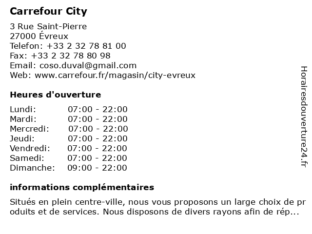 1 Carrefour City (Distance: 0,61 km) 4 Rue Jean Jaurès, 27000 Évreux carrefour, city, hard discount, hypermarchés, les dépanneurs, supermarchés 2 Carrefour Drive (Distance: 0,61 km) 4 Rue Jean Jaures, 27000 Évreux alimentaire, carrefour, courses, drive, en ligne, magasin 3 Carrefour Express (Distance: 4,85 km) - Place de la Résistance, 27180 Saint-Sébastien-Morsent alimentation, carrefour, express, magasin discount, market, supermarché 4 Carrefour Drive (Distance: 7,11 km) - Route Nationale 13, 27930 Guichainville carrefour, drive, hypermarche, marche, market 5 Carrefour (Distance: 14,76 km) . route nationale 13, 14120 Mondeville beaute, cafe, carrefour, chaussures, enfants, lingerie, mode femmes, mode hommes, restaurant, sport 6 Carrefour Location (Distance: 16,26 km) - Lieu-Dit La Justice, 27220 Saint-André-de-l’Eure agence, carrefour, location, utilitaires, véhicules |