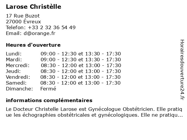 1 Dr Christelle Larose - Gynécologue Obstétricien (Distance: 2,74 km) - Rue Léon Schwartzenberg, 27015 Évreux bebe, christelle, dr, gynecologie, gynécologue, larose, maternite, maternité, obstetrique, obstétricien 2 Christelle Rouzée - Ostéopathe (Distance: 38,87 km) 1 Allée Guillaume le Conquérant, 27800 Brionne brionne, christelle, christèlle, osteopathe, osteopathie, osteopraticien, ostéopathe, rouzée |