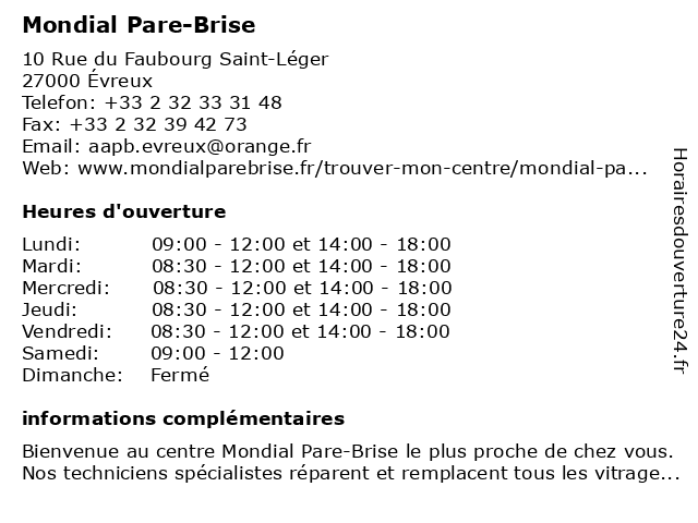 1 Mondial Pare-Brise (Distance: 19,59 km) 36 Place du Champ de ville, 27400 Louviers brise, mondial, pare 2 Mondial Pare-Brise Evreux (Distance: 0,00 km) 10 Rue du Faubourg Saint-Léger, 27000 Évreux brise, evreux, mondial, pare 3 Rapid Pare-Brise (Distance: 1,72 km) 62 Avenue du Maréchal Foch, 27000 Evreux automobile, brise, pare, pare-brise, rapid, remplacement, réparation, vitrage, voiture 4 France Pare Brise (Distance: 1,99 km) 20 Rue Pierre Semard, 27000 Évreux bris de glace, brise, france, pare, pare brise, services 5 SOS Pare-Brise (Distance: 2,19 km) 328 Rue Jacques Monod, 27000 Évreux auto, brise, pare, phare, remplacement, rénovation, réparation, sos, vitrage, véhicule 6 123 Pare-Brise Evreux (Distance: 3,06 km) 1255 Route de Paris, 27930 Le Vieil-Évreux 123, 123 pare-brise, bris de glace, brise, calibrage caméra adas, carte cadeau, changement pare-brise, evreux, franchise offerte, lunette arrière, pare, pare-brise, remplacement pare-brise, réparation pare-brise, toit panoramique, vitre latérale |