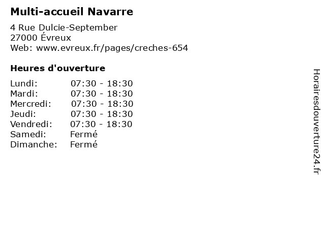 1 École maternelle publique Navarre (Distance: 0,02 km) 8 Rue Dulcie September, 27000 Évreux cours, maternelle, navarre, publique, services, école 2 École Primaire Publique de Navarre (Distance: 0,10 km) 109 Avenue Aristide Briand, 27000 Évreux cours, de, navarre, primaire, publique, services, école 3 Bibliothèque de Navarre (Distance: 0,35 km) 1 rue Paul Bonneau, 27002 Evreux bibliothèque, cd audio, cd.rom, de, livres, navarre, revues 4 Multi-accueil Centre ville - N°1 (Distance: 2,40 km) 52 Rue Isambard, 27000 Évreux accueil, centre, crèche, enfant, garde d'enfants, jardin d'enfants, multi, n°1, pédagogie, soins toute la journée, ville 5 Multi-accueil Centre ville - N°2 (Distance: 2,40 km) 52 Rue Isambard, 27000 Évreux accueil, centre, crèche, enfant, garde d'enfants, jardin d'enfants, multi, n°2, pédagogie, soins toute la journée, ville 6 Multi-accueil Saint-Michel (Distance: 2,42 km) 4 Rue des Frères-Montgolfier, 27000 Évreux accueil, crèche, enfant, garde d'enfants, jardin d'enfants, michel, multi, pédagogie, saint, soins toute la journée |