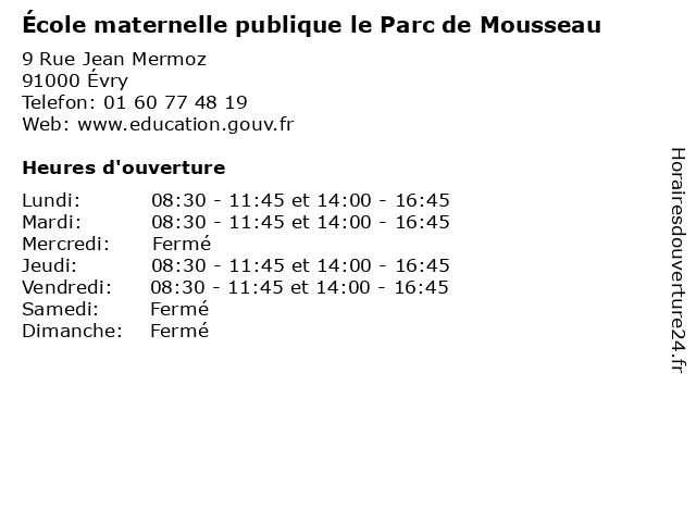 | Mardi | 08:30-11:45 et 14:00-16:45 |