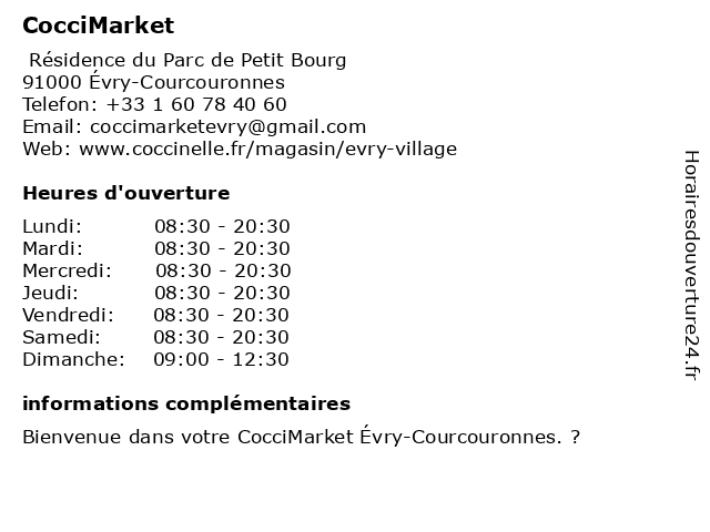 1 CocciMarket (Distance: 2,16 km) 14bis allée de l'Orme À Martin, 91080 Évry-Courcouronnes alimentation, coccimarket, fruits, légumes, market, épicerie 2 Coccimarket (Distance: 8,48 km) 49 Rue Edouard Vaillant, 91200 Athis-Mons coccimarket, liquor, market, supermarket 3 CocciMarket (Distance: 8,71 km) 45 Rue Gabriel Peri, 91330 Yerres aliments, coccimarket, consommation, marchandises, marché, shop, shopping, supermarche 4 CocciMarket (Distance: 8,74 km) 6 Esplanade de la Ferme, 91800 Boussy-Saint-Antoine alimentation, boisson, coccimarket, fruits, légumes, épicerie 5 CocciMarket (Distance: 10,03 km) 5 Mail de l'Europe, 91240 Saint-Michel-sur-Orge alimentation, coccimarket, magasin, superette, supermarché, épicerie 6 CocciMarket (Distance: 15,21 km) 58-62 boulevard de Stalingrad, 94600 Choisy-le-Roi alimentation, coccimarket, epiceries, supérette |