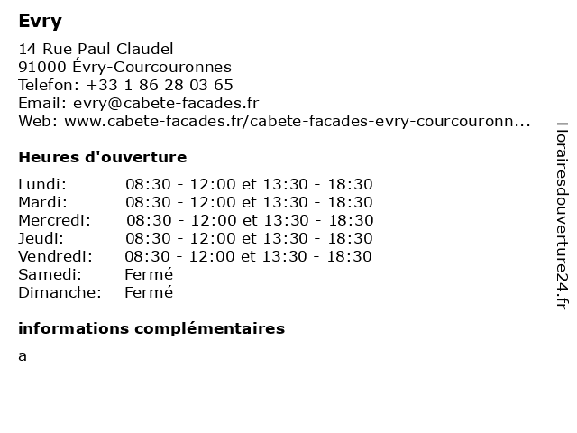 | Lundi | 08:30-12:00 et 13:30-18:30 |