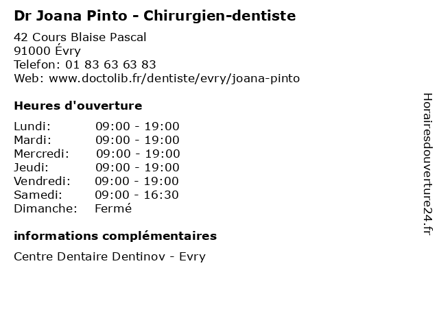 1 Angela Pinto da Rocha - Psychologue (Distance: 2,80 km) 40 avenue Serge Dassault, 91106 Corbeil-Essonnes angela, consultation, da, docteur, med, médecin, médecine, pinto, psychologue, rocha, traitement 3 Dr Joana Gomes Dos Santos - Chirurgien-dentiste (Distance: 8,75 km) 1 Place du Marché, 91240 Saint-Michel-sur-Orge chirurgien, dentiste, dos, dr, gomes, joana, médecin, médecine, médical, pharmaceutique, santos, traitement 4 Dr Francisco Da Costa Pinto - Chirurgien-dentiste (Distance: 9,27 km) 1 Avenue du Président Robert Lakota, 91270 Vigneux-sur-Seine chirurgien, costa, da, dentaire, dentiste, dr, francisco, implantologie, parodontologie, pinto 6 Dr Joana Andrade - Chirurgien-dentiste (Distance: 17,01 km) 1 Place de l'Union Européenne, 91300 Massy andrade, chirurgien, dentaire, dentiste, dr, implantologie, joana, parodontologie |