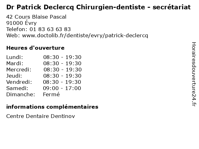 1 Dr Patrick Costes - Médecin généraliste (Distance: 6,33 km) 1 Rue de la Mare À Tissier, 91280 Saint-Pierre-du-Perray consultation, costes, docteur, dr, générale, généraliste, libre, medecins, médecin, médecine, patrick, santé 2 Dr Patrick Chicha - Médecin généraliste (Distance: 6,37 km) 1 Rue de la Mare À Tissier, 91280 Saint-Pierre-du-Perray chicha, docteur, dr, generaliste, généraliste, medecin, médecin, patrick, soins 3 Dr Patrick Costes - Médecin généraliste (Distance: 6,37 km) 1 Rue de la Mare À Tissier, 91280 Saint-Pierre-du-Perray costes, docteur, dr, generaliste, généraliste, medical, médecin, patrick, soin 4 Mathilde Declercq - Hypnothérapeute (Distance: 8,35 km) 40 Avenue d'Epinay, 91360 Villemoisson-sur-Orge declercq, hypnose, hypnotherapeute, hypnothérapeute, mathilde, sante, soins 5 Dr Patrick Sayada - Chirurgien-dentiste (Distance: 8,76 km) - Carré Sénart - centre commercial Carrefour, 77127 Lieusaint chirurgien, dentaire, dentiste, dr, implantologie, parodontologie, patrick, sayada 6 Guillemin Patrick Gilbert (Distance: 9,86 km) 4 b Rue De La Gare, 91800 Brunoy boucheries, gilbert, guillemin, patrick, poissonneries |