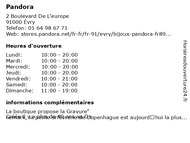 3 Pandora (Distance: 13,83 km) 20 Place du Marche, 91290 Arpajon bagues, bijouterie, bracelets, colliers, pandora 4 Pandora (Distance: 14,77 km) Rue du Luxembourg, 94320 Thiais bagues, bijouterie, bijoux, bijoux personnalisés, bracelets, charms, charms pandora, colliers, pandora, pendentifs 6 Pandora (Distance: 16,82 km) Avenue de la France libre, 94000 Créteil bagues, bijouterie, bijoux, bijoux personnalisés, bracelets, charms, charms pandora, colliers, pandora, pendentifs |