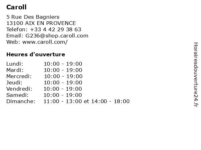 1 Caroll (Distance: 0,02 km) 5 Rue des Bagniers, 13100 Aix-en-Provence accessoires, caroll, mode, vetements 2 Caroll (Distance: 13,90 km) 2 Rue de Lisbonne, 13480 Cabries beaute &sante, bijoux, boutigue, caroll, decoration, mode femmes, mode hommes, optique, restaurants, sport 3 Caroll (Distance: 16,68 km) . Avenue Plan De Campagne, 13480 Cabries cafe, caroll, chaussures, enfants, lingerie, mode femme, mode homme, restaurant 4 Caroll (Distance: 16,92 km) 113 Route Nationale, 13127 Vitrolles accessories, cafe, caroll, costume, homme, mode, pantalons, pulls, restaurant, service 5 Caroll (Distance: 17,74 km) Route National 13, 13127 VITROLLES blazer femme, cardignan femme, caroll, chaussures femme, gilet femme, jean femme, magasin femme, magasin vêtements, manteau femme, mode femme, pull femme, robe femme, sac femme, t-shirt femme, tailleur femme, top femme, vêtements femmes 6 |