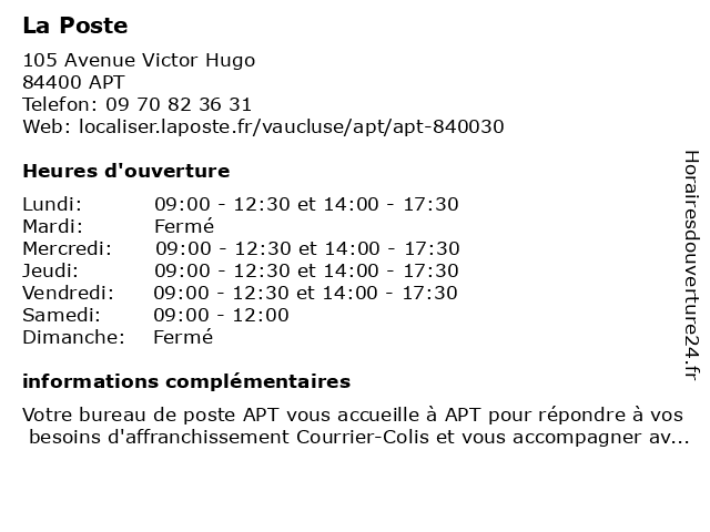 1 La Poste (Distance: 2,44 km) - Route Nationale 100, 04420 La Javie agence, assurance, banque, banque postale, bureau de poste, chronopost, colis, courrier, dps, expéditions internationales, la, point, postale, poste, relais, timbres, téléphonie, ups, western union 2 La Poste (Distance: 5,25 km) 5 Place de la Mairie, 84400 Villars agence, colis, courriers, expédition, la, postale, poste, relais 3 La Poste (Distance: 5,27 km) - Le Bourg, 84400 Villars agence, assurance, banque, banque postale, bureau de poste, chronopost, colis, courrier, dps, expéditions internationales, la, point, postale, poste, relais, timbres, téléphonie, ups, western union 5 La Poste (Distance: 8,41 km) - Place de la Mairie, 84220 Murs agence, assurance, banque, banque postale, bureau de poste, chronopost, colis, courrier, dps, expéditions internationales, la, point, postale, poste, relais, timbres, téléphonie, ups, western union 6 La Poste (Distance: 9,94 km) - Route de Viens, 84750 Saint-Martin-de-Castillon agence, assurance, banque, banque postale, bureau de poste, chronopost, colis, courrier, dps, expéditions internationales, la, point, postale, poste, relais, timbres, téléphonie, ups, western union |