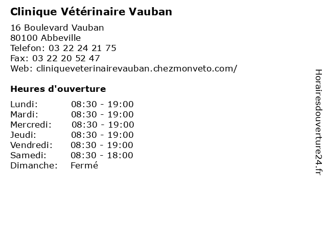 | 1 Hôtel Le Relais Vauban - Réception (Distance: 0,04 km) 4 Boulevard Vauban, 80100 Abbeville bar, hotel, hôtel, le, relais, restaurant, réception, service, vauban 3 Clinique Vétérinaire de la Poste (Distance: 0,36 km) 25 place Clemenceau, 80100 Abbeville clinique, de, la, poste, services, veterinaire, vétérinaire 4 Clinique Vétérinaire du Marché (Distance: 0,61 km) 42 place du Grand Marché, 80100 Abbeville chat, chien, clinique, consultation, du, marché, nac, vétérinaire 5 Clinique Sainte Isabelle (Distance: 1,89 km) 236 Route d'Amiens, 80100 Abbeville clinique, isabelle, sainte 6 Service de radiologie clinique Sainte Isabelle (Distance: 1,89 km) 236 Route d'Amiens, 80100 Abbeville clinique, de, isabelle, radiologie, sainte, service |