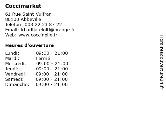 1 CocciMarket (Distance: 12,96 km) 39 Rue de la République, 80490 Hallencourt alimentation, coccimarket, magasin, superette, supermarché, épicerie 2 CocciMarket (Distance: 16,83 km) 21 rue du Maréchal Leclerc de Hautcloque, 80150 Crécy-en-Ponthieu alimentation, coccimarket, fruits, légumes, market, épicerie 3 Monoprix (Distance: 0,36 km) 38 Rue Du Maréchal Foch, 80100 Abbeville alimentation, hypermarché, magasin, monoprix, supermarché 4 Carrefour Contact (Distance: 24,64 km) 11 Route de Canaples, 80370 Bernaville alimentaire, alimentation, carrefour, contact, courses, distributeur, hypermarché, supermarché, épicerie 5 CocciMarket (Distance: 30,69 km) 4 Rue de Doullens, 80750 Candas alimentation, coccimarket, magasin, superette, supermarché, épicerie 6 Vival (Distance: 32,79 km) 6 Quai Francois 1er, 76470 Le Tréport alimentaire, discount, distributeur, distribution, fruits, grande, hypermarché, légumes, supermarché, vival, épicerie |