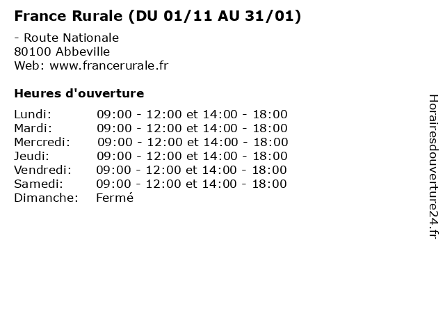 1 France Rurale (DU 01/11 AU 31/01) (Distance: 5,85 km) - Le Plessiel, 80100 Drucat 01/11, 31/01, articles de jardin, au, du, france, prodagricole charmeil alimentation animale équipement pour équitation, rurale, sellerie jardineries, végétaux 2 France Rurale (DU 01/02 AU 30/10) (Distance: 0,00 km) - Route Nationale, 80100 Abbeville 01/02, 30/10, articles de jardin, au, du, france, prodagricole charmeil alimentation animale équipement pour équitation, rurale, sellerie jardineries, végétaux 3 France Rurale (DU 01/02 AU 30/10) (Distance: 5,85 km) - Le Plessiel, 80100 Drucat 01/02, 30/10, articles de jardin, au, du, france, prodagricole charmeil alimentation animale équipement pour équitation, rurale, sellerie jardineries, végétaux 4 Gamm vert (du 17 Février au 01 Juin) (Distance: 13,42 km) . RUE CARNOT, 80270 AIRAINES 01, 17, animalerie, animaux, au, du, février, gamm, horticulteur, jardin, jardinerie, juin, vert 5 Déchèterie (Distance: 26,17 km) - Rue du Marais, 76340 Blangy-sur-Bresle 01/11, 31/03, au, du, déchèterie, gravats, huiles usées, la réception des déchets et écocentres, les appareils électroménagers, les déchets verts, papier et carton en quantité 6 Déchèterie (Eté (01/04 au 31/10):) (Distance: 44,54 km) - Route de Doullens, 62158 Saulty 01/04, 31/10, au, déchèterie, eté, gravats, huiles usées, la réception des déchets et écocentres, les appareils électroménagers, les déchets verts, papier et carton en quantité |