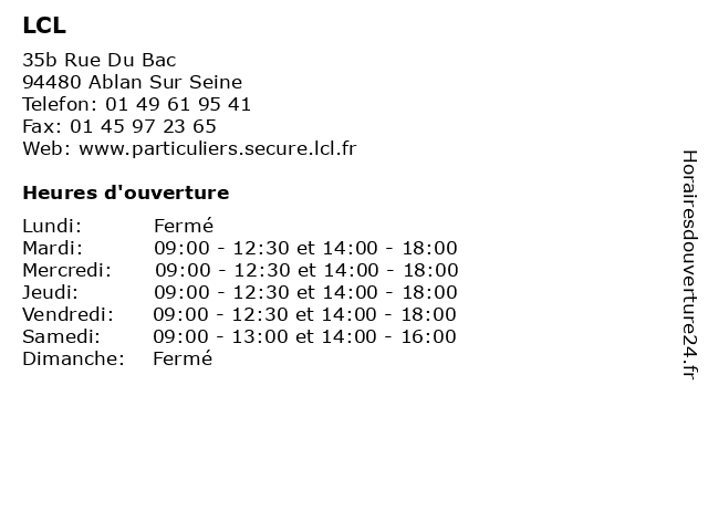 1 LCL (Distance: 0,54 km) 335 Avenue Georges Clemenceau, 78670 Villeneuve Sur Seine banque, crédit, lcl, service 5 6 LCL (Distance: 8,96 km) 176 Rue Paul Vaillant Couturier, 94140 Alfortville banque, crédit, lcl, service |
