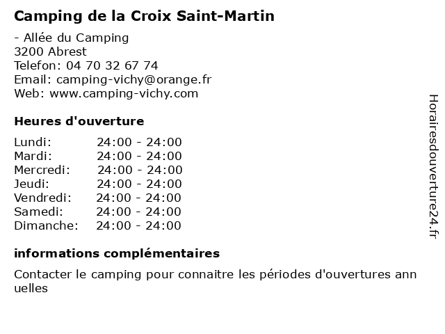 1 Camping de la Croix St Martin - Snack (Juin, juillet et août) (Distance: 0,00 km) - Allée du Camping, 03200 Abrest août, camping, croix, de, et, hebergement, juillet, juin, la, martin, snack, st, tourisme 2 Camping de la Croix Saint-Martin - Epicerie (Distance: 0,00 km) - Allée du Camping, 03200 Abrest camping, croix, de, epicerie, hebergement, la, martin, saint, st, tourisme 3 Camping de la Croix Saint-Martin - Réception (Haute saison) (Distance: 0,00 km) - Allée du Camping, 03200 Abrest camping, croix, de, haute, hebergement, la, martin, réception, saint, saison, st, tourisme 4 Camping de la Croix Saint-Martin - Réception (basse saison) (Distance: 0,00 km) - Allée du Camping, 03200 Abrest basse, camping, croix, de, hebergement, la, martin, réception, saint, saison, st, tourisme 6 Dr Olivier Martin - ORL (Distance: 2,19 km) - Boulevard Denière, 03207 Vichy consultation, docteur, dr, martin, med, médecin, médecine, olivier, orl, traitement |