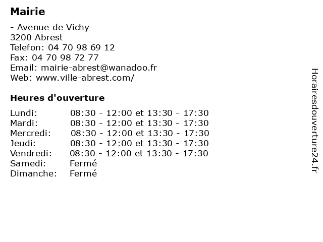 1 Mairie (Distance: 1,25 km) - Place de la Mairie, 03270 Hauterive administration, mairie, public, service 2 Mairie (Distance: 6,68 km) 17 chemin de l'Ancienne-Église, 03700 Serbannes administration, mairie, public, service 3 Mairie (Distance: 6,71 km) 37 rue de la Mairie, 03300 Creuzier-le-Vieux administration, mairie, public, service 6 Mairie (Distance: 9,37 km) 19 rue de la Mairie, 03300 Creuzier Le Neuf administration, mairie, public, service |