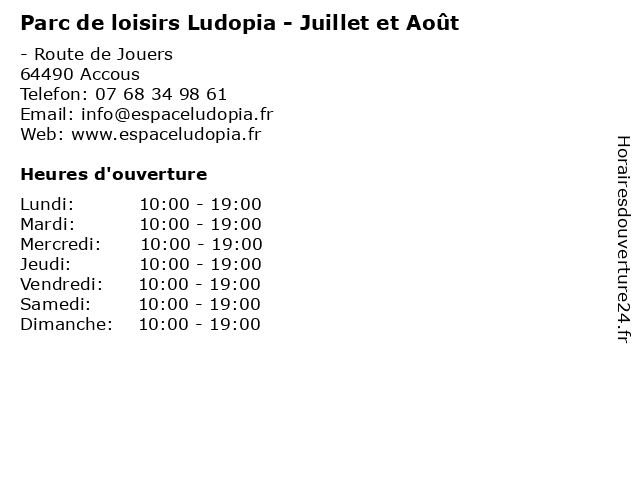 1 Parc de Loisirs Ludopia - Avril à Juin, Septembre et Octobre (Vacances Scolaires) (Distance: 0,00 km) - Route de Jouers, 64490 Accous adultes, avril, de, enfants, et, familial, jeux, juin, labyrinthe, loisirs, ludopia, octobre, parc, scolaires, sensorielle, septembre, vacances 2 Parc de loisirs Ludopia - Avril à Mai, Septembre et Octobre (Distance: 0,00 km) - Route de Jouers, 64490 Accous adultes, avril, de, enfants, et, familial, jeux, labyrinthe, loisirs, ludopia, mai, octobre, parc, sensorielle, septembre 3 Parc de loisirs Ludopia - Novembre (Vacances Scolaires) (Distance: 0,00 km) - Route de Jouers, 64490 Accous adultes, de, enfants, familial, jeux, labyrinthe, loisirs, ludopia, novembre, parc, scolaires, sensorielle, vacances 4 Parc de loisirs Ludopia - Novembre (Distance: 0,00 km) - Route de Jouers, 64490 Accous adultes, de, enfants, familial, jeux, labyrinthe, loisirs, ludopia, novembre, parc, sensorielle 5 Parc'Ours (Mai à Août) (Distance: 8,83 km) - Espace Animalier - Route Départementale 739, 64490 Borce animalier, août, associations, mai, ours, parc, parc'ours, refuge 6 Parc'Ours (Novembre à Janvier) (Distance: 8,83 km) - Espace Animalier - Route Départementale 739, 64490 Borce animalier, associations, ends, et, janvier, les, novembre, ours, parc, parc'ours, pendant, refuge, vacances, week |