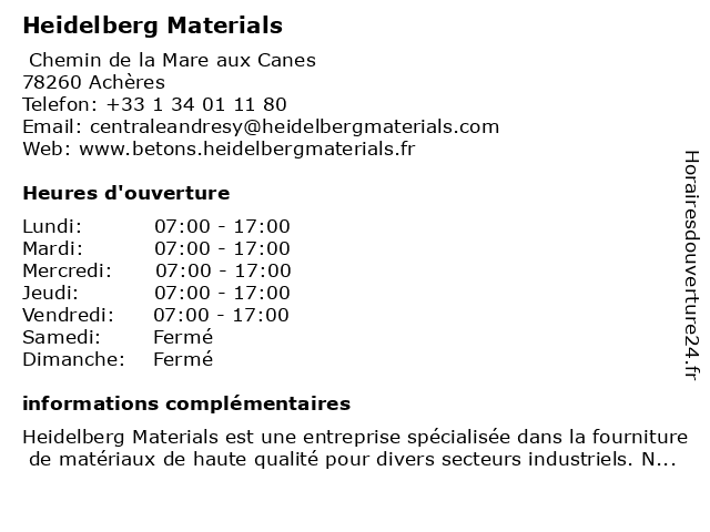 1 Carrière de granulats Heidelberg Materials d'Achères (Distance: 0,23 km) Chemin de la Mare aux Canes, 78260 Achères carrière, d'achères, de, granulats, heidelberg, materials 2 Carrière de granulats Heidelberg Materials de Carrières-sous-Poissy (Distance: 5,01 km) Chemin des Graviers, 78510 Triel-sur-Seine carrière, carrières, de, granulats, heidelberg, materials, poissy, sous 3 Centrale à béton Heidelberg Materials d'Epluches (Distance: 10,24 km) Rue d'Epluches, 95310 Saint-Ouen-l'Aumône béton, centrale, d'epluches, heidelberg, materials 4 Centre de distribution Heidelberg Materials de Gennevilliers (Distance: 15,23 km) 11 Route du Port Charbonnier, 92230 Gennevilliers centre, de, distribution, gennevilliers, heidelberg, materials 5 Centrale à béton Heidelberg Materials de Gennevilliers (Distance: 15,69 km) Route de la Seine, 92230 Gennevilliers béton, centrale, de, gennevilliers, heidelberg, materials 6 Centrale à béton Heidelberg Materials de Clichy (Distance: 18,10 km) 30 Quai de Clichy, 92110 Clichy béton, centrale, clichy, de, heidelberg, materials |