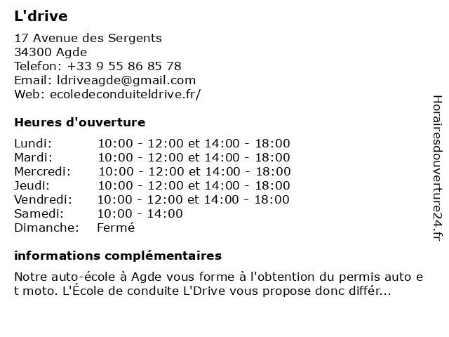 1 Best Drive (Distance: 2,88 km) - Route de Sète, 34300 Agde auto, best, drive, maintenance, pneus, services 2 Quick (Drive) - CC Intermarche (Distance: 3,07 km) , Route de Sète, 34300 Agde burger, cc, drive, hamburger, intermarche, la nourriture, les boissons, les convives, quick, sandwich 3 Promocash - Drive (Distance: 3,15 km) 1 Rue du Moulin à Huile, 34300 Agde alimentaire, avril, cafés-bars, drive, hôtellerie, octobre, promocash, restauration 4 Arches d Oc Drive Sarl (Distance: 3,73 km) Boulevard Du Soleil, 34300 Agde arches, drive, restaurants 5 Carrefour Drive (Distance: 8,33 km) . Route de Bessan, 34340 Marseillan carrefour, drive, hypermarche, marche, market 6 |