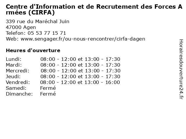 Termes de recherche pour Centre d'Information et de Recrutement des Forces Armées (CIRFA):agen, et, de, des, administration, services, centre, recrutement, publics, d'information, armées, cirfa, organismes, forces |